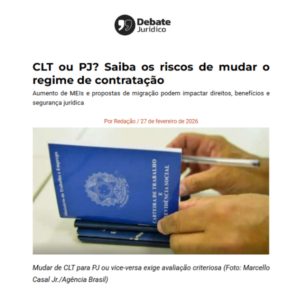 Saiba mais no Debate Jurídico: https://www.debatejuridico.com.br/noticias/clt-ou-pj-especialista-alerta-para-riscos-de-mudar-regime-de-contratacao/